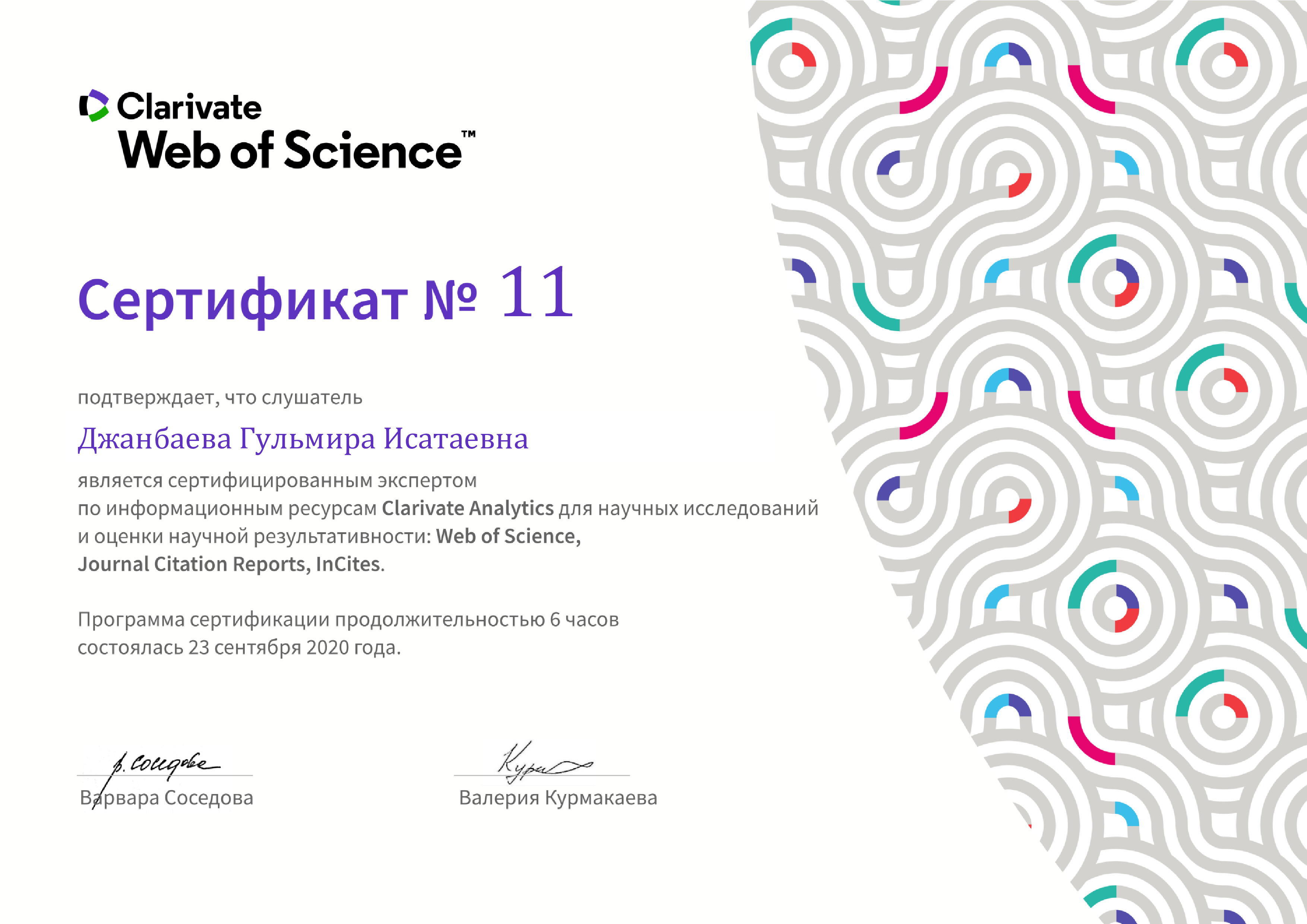 Janbayeva Gulmira Isatayevna completed training and received a special certificate as a certified expert in the field of information and analytical platform Web of Science.